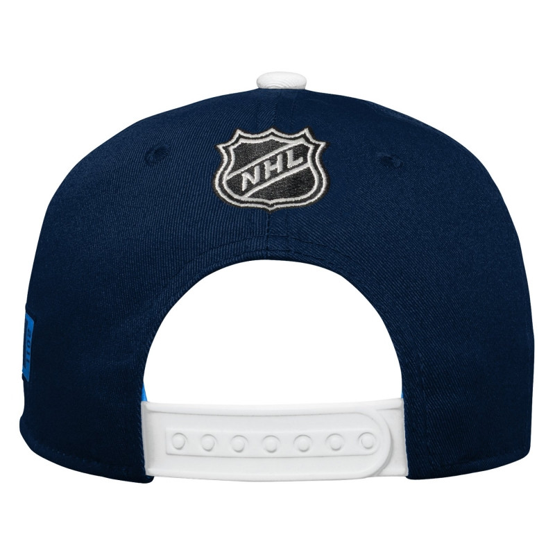 Dětská hokejová kšitovka NHL v modrém provedení se zahnutým kšiltem a plastovým páskem pro úpravu velikosti. Velké logo na přední straně a malá nášivka z boku.