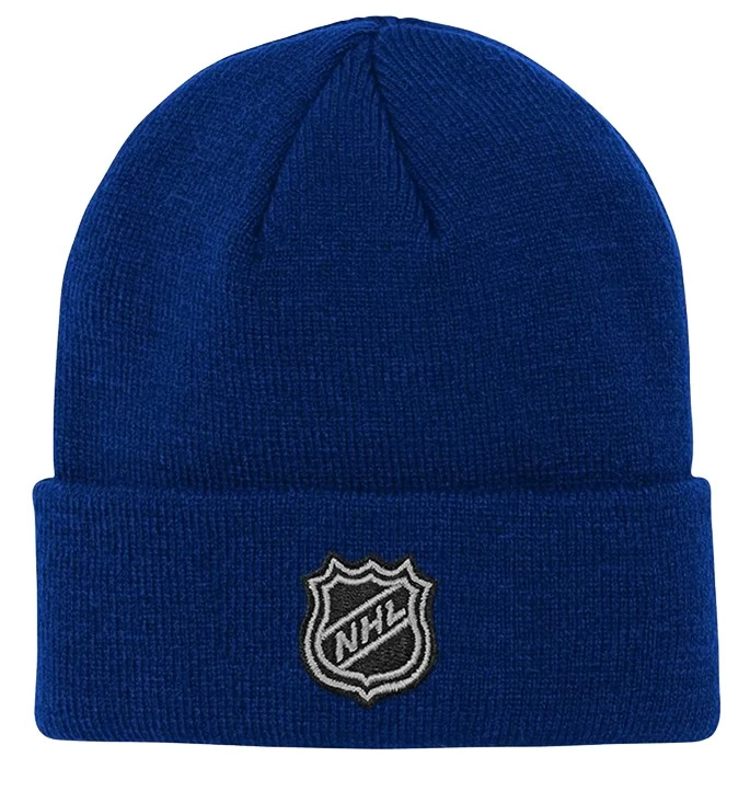 Parádní jednoduchá dětská zimní čepice NHL. Zimní čepici bez bambule s manžetovým designem zdobí vepředu nášivka loga týmu a vzadu nášivka loga NHL.