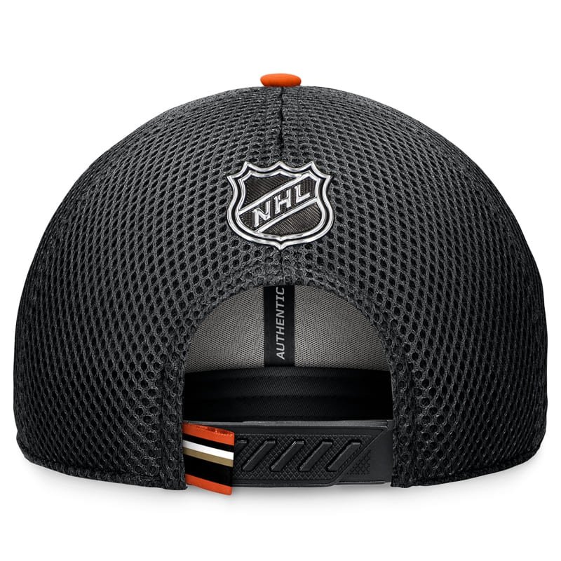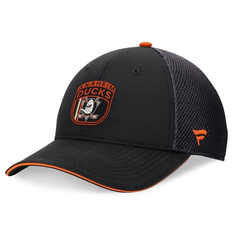 Oficiální kšiltovka Anaheim Ducks od značky Fanatics z limitované kolekce Authentic Pro Draft 2024. Černý trucker design s šestipanelovým střihem, 6 obšitými větracími otvory, prohnutým prošitým kšiltem a síťovinovou zadní částí.