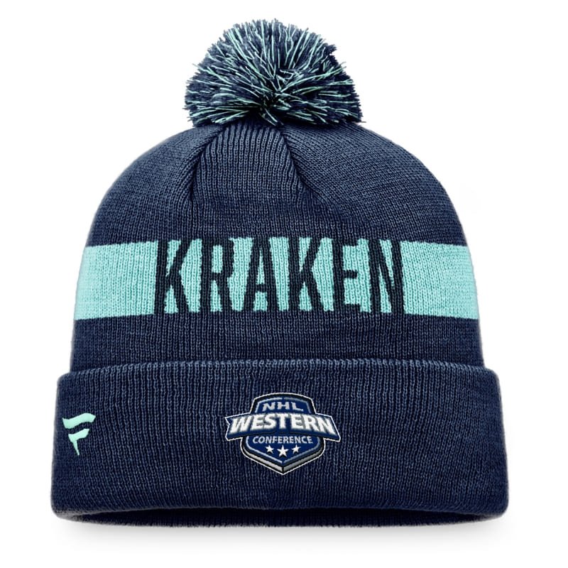 Parádní hokejový kulich NHL v tmavě modrém provedení s bambulí a ohrnem. Vyšité logo týmu na přední straně a vzadu vyšitá konference.