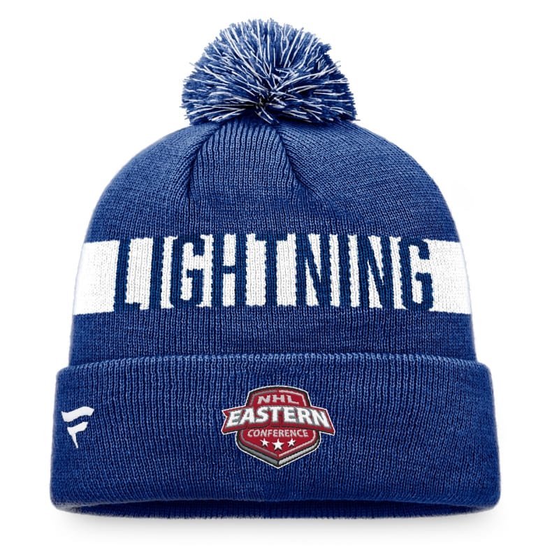 Parádní hokejový kulich NHL v modrém provedení s bambulí a ohrnem. Vyšité logo týmu na přední straně a vzadu vyšitá konference.