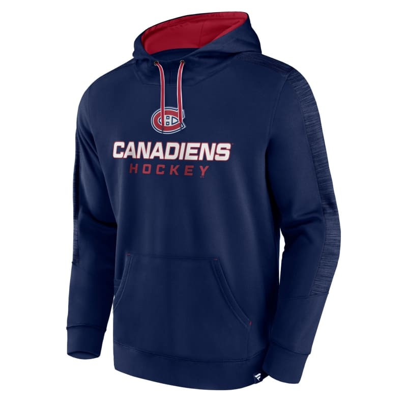 Stylová hokejová mikina NHL přes hlavu s kapucí a klokaní kapsou na břiše. Modré provedení s červeným vnitřkem kapuce. Potisk na hrudi.